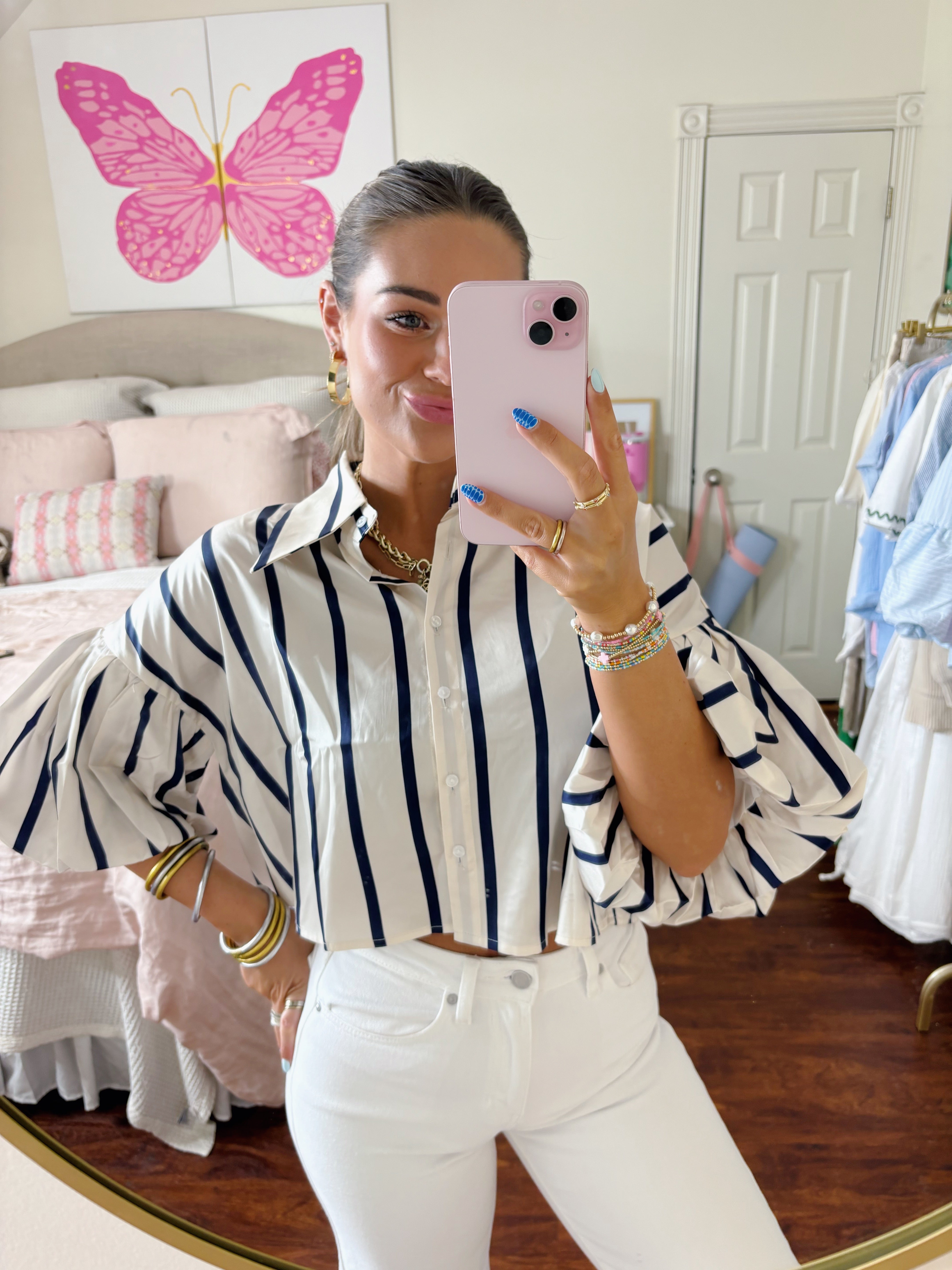 REBECCA BUBBLE SLEEVE TOP - NAVY